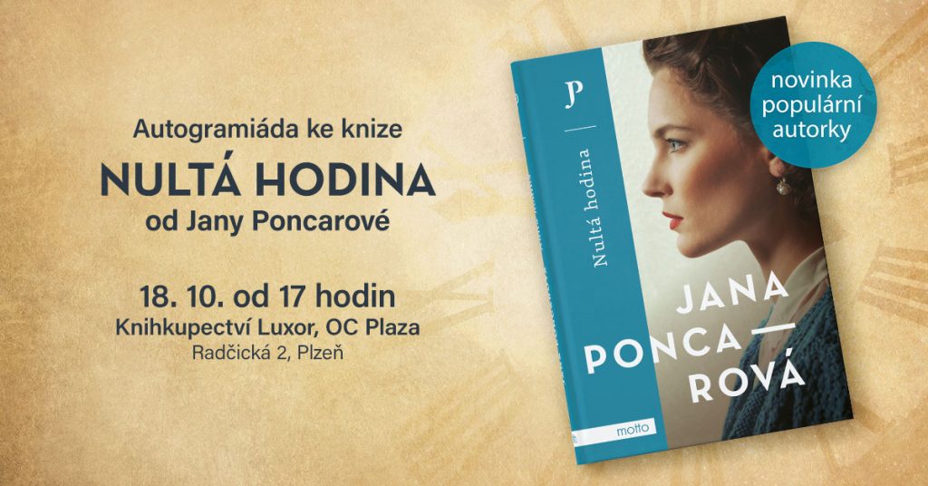 Srdečně vás zveme na autogramiádu oblíbené autorky Jany Poncarové k její nové knize Nultá hodina. Akce proběhne ve čtvrtek 18. října od 17 hodin v Knihkupectví Luxor v OC Plaza v Plzni. Vstup je zdarma. Těšíme se na viděnou!