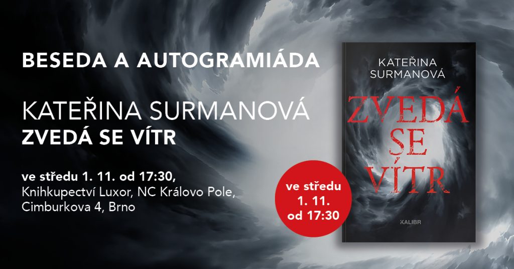 Srdečně vás zveme na besedu a autogramiádu autorky Kateřiny Surmanové k její nové knize Zvedá se vítr. Akce proběhne ve středu 1. listopadu od 17:30 v Knihkupectví Luxor v NC Královo Pole (Cimburkova 4, Brno). Těšíme se na viděnou!