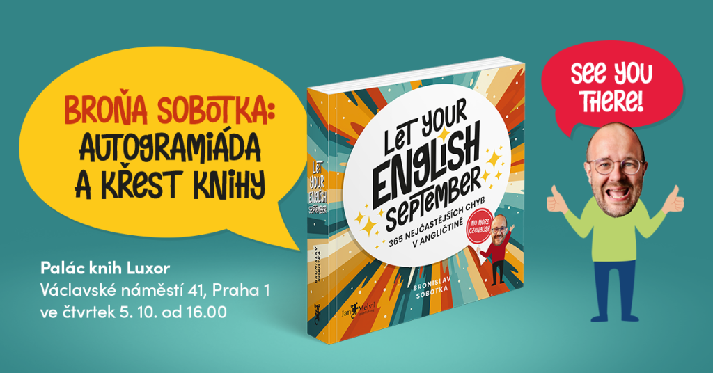 Srdečně vás zveme na křest hravé příručky oblíbeného lektora angličtiny Broni Sobotky Let Your English September: 365 nejčastějších chyb v angličtině. Křest knihy s autogramiádou autora proběhne ve čtvrtek 5. října od 16 hodin v kavárně Paláce knih Luxor v Praze (Václavské náměstí 41, 1. patro).