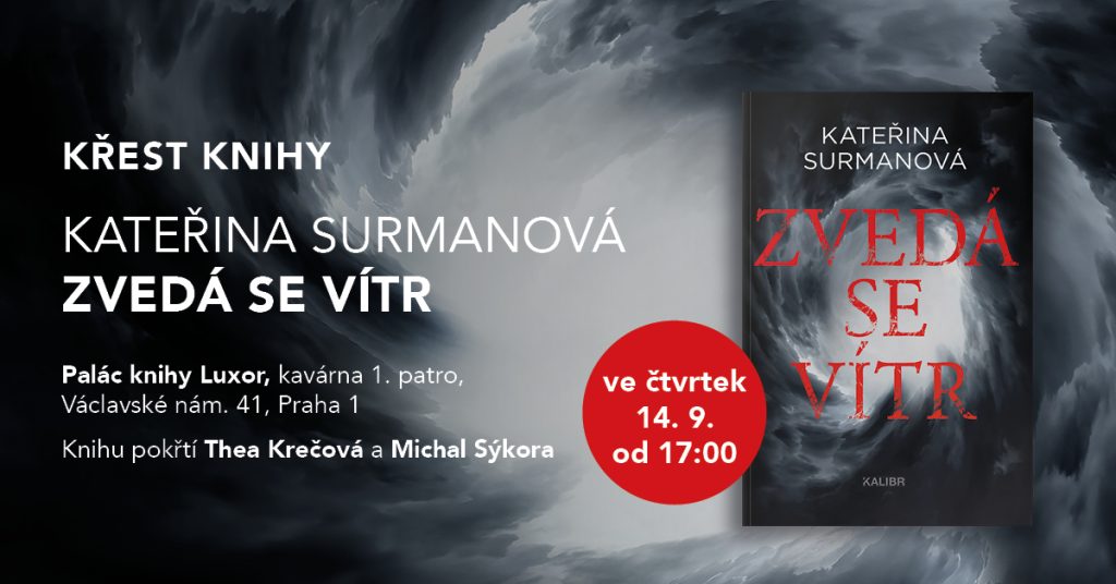 Srdečně vás zveme na křest mrazivého thrilleru Kateřiny Surmanové Zvedá se vítr, který proběhne ve čtvrtek 14. září od 17 hodin v kavárně Paláce knih Luxor v Praze (Václavské náměstí 41, 1. patro). Knihu pokřtí Thea Krečová a Michal Sýkora.
