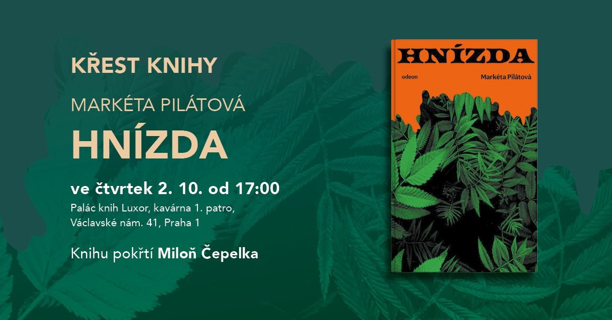 Srdečně vás zveme na křest knihy Markéty Pilátové Hnízda. Akce proběhne ve čtvrtek 2. října od 17 hodin v kavárně Paláce knih Luxor (Václavské nám. 41, 1. patro).