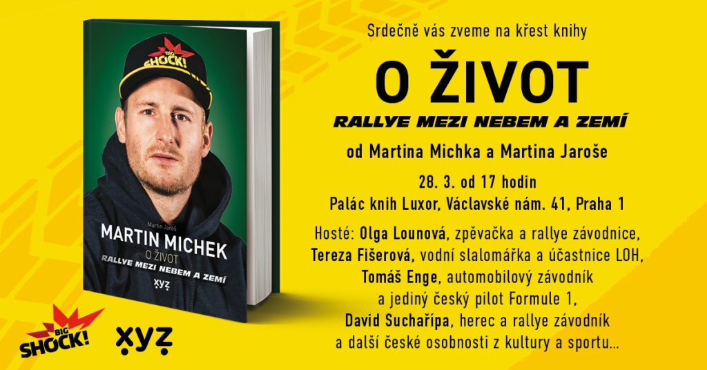 Srdečně vás zveme na křest knihy Martina Michka a Michala Jaroše O život: Rallye mezi nebem a zemí, který se uskuteční v úterý 28. března 2023 v 17:00 v kavárně Paláce knih Luxor (Václavské náměstí 41, 1. patro). Dorazí i zajímaví hosté: zpěvačka a rallye závodnice Olga Lounová, vodní slalomářka a účastnice LOH Tereza Fišerová, automobilový závodník a jediný český pilot Formule 1 Tomáš Enge, herec a rallye závodník David Suchařípa a další české osobnosti z kultury a sportu.