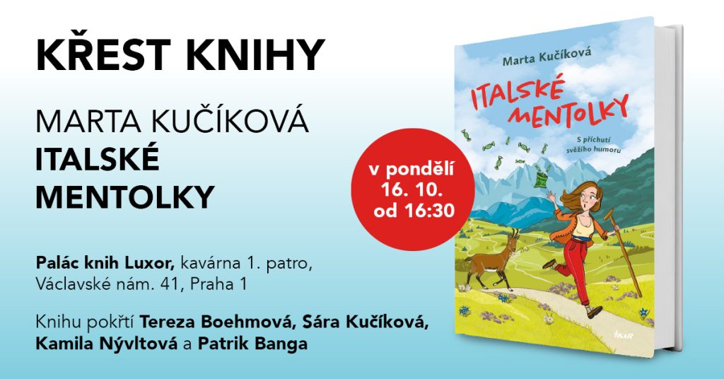Srdečně vás zveme na křest knihy Marty Kučíkové Italské mentolky, který proběhne v pondělí 16. října od 16:30 v kavárně Paláce knih Luxor v Praze (Václavské nám. 41, 1. patro). Knihu pokřtí Tereza Boehmová, Sára Kučíková, Kamila Nývltová a Patrik Banga.