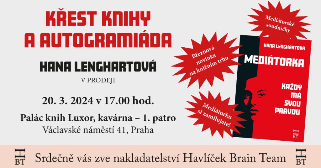 Srdečně vás zveme na křest povídkové knihy Mediátorka a autogramiádu její autorky Hany Lenghartové. Akce proběhne ve středu 20. března od 17 hodin v kavárně Paláce knih Luxor (Václavské nám. 41, 1. patro) v Praze.