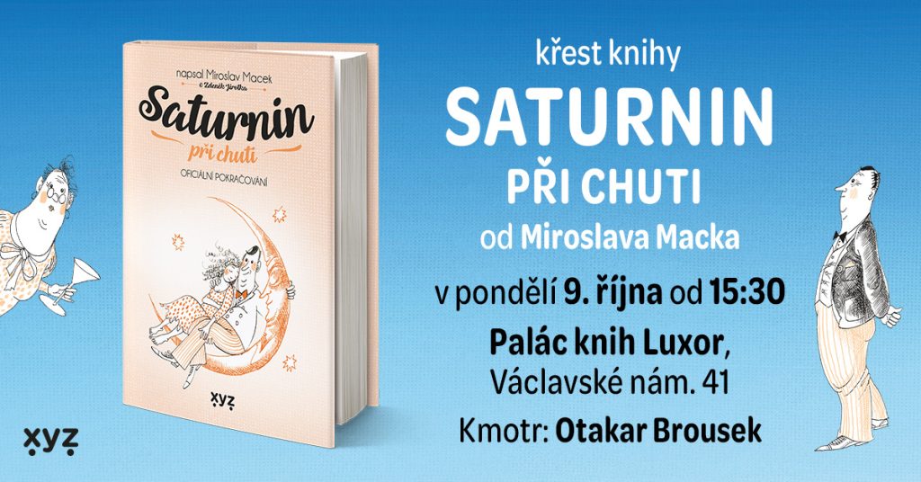 Srdečně vás zveme na křest knihy Saturnin při chuti autora Miroslava Macka, který proběhne v pondělí 9. října od 15:30 v kavárně Paláce knih Luxor v Praze (Václavské náměstí 41, 1. patro). Román pokřtí Otakar Brousek.