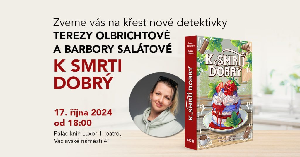 Srdečně vás zveme na křest nové detektivky K smrti dobrý od finalistky soutěže Peče celá země Terezy Olbrichtové a spoluautorky Barbory Salátové. Akce proběhne ve čtvrtek 17. října od 18:00 v kavárně Paláce knih Luxor (Václavské nám. 41, 1. patro) v Praze.