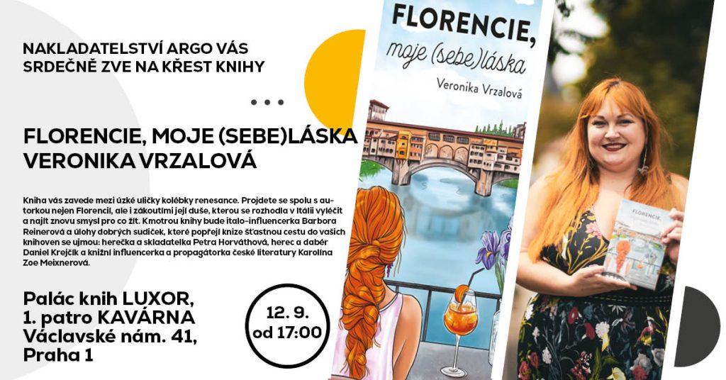 Knihkupectví Luxor a nakladatelství Argo vás srdečně zvou na křest knihy Veroniky Vrzalové Florencie, moje (sebe)láska, ve které s autorkou projdete zákoutí Florencie i její duše. Křest proběhne ve čtvrtek 12. září od 17 hodin v kavárně Paláce knih Luxor (Václavské nám. 41, 1. patro) v Praze.
