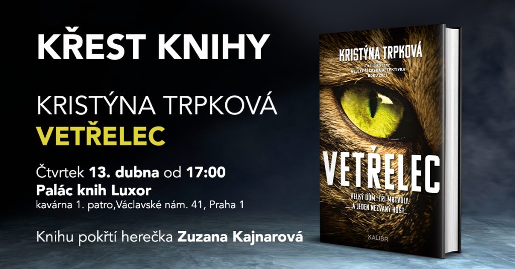 Srdečně vás zveme na křest detektivky Kristýny Trpkové Vetřelec, který se uskuteční ve čtvrtek 13. dubna 2023 v 17:00 v kavárně Paláce knih Luxor (Václavské náměstí 41, 1. patro). Knihu pokřtí herečka Zuzana Kajnarová.