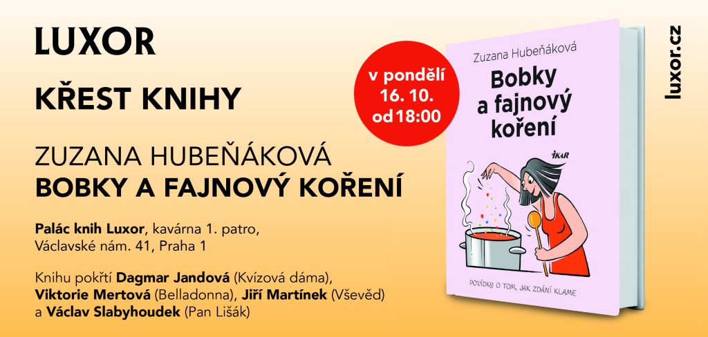 Srdečně vás zveme na křest nové knihy Zuzany Hubeňákové, humornou sbírku povídek s názvem Bobky a fajnový koření. Ten proběhne v pondělí 16. října od 18 hodin v kavárně Paláce knih Luxor v Praze (Václavské nám. 41, 1. patro).