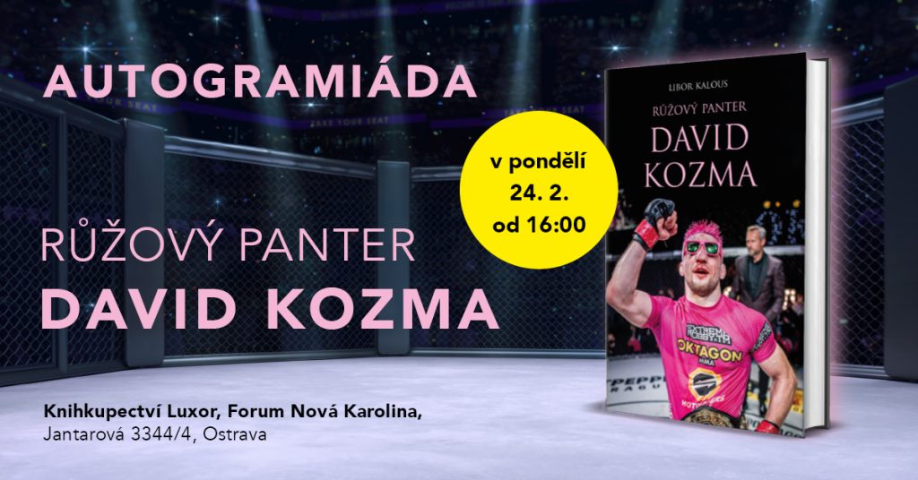 Srdečně vás zveme na autogramiádu MMA bojovníka Davida Kozmy ke knize David Kozma: Růžový panter. Ta proběhne v pondělí 24. února od 16 hodin v knihkupectví Luxor v OC Forum Nová Karolina v Ostravě. Přijďte se setkat s nejdéle vládnoucím šampionem welterové váhy OKTAGONU a nechte si podepsat jeho životopisnou knihu!