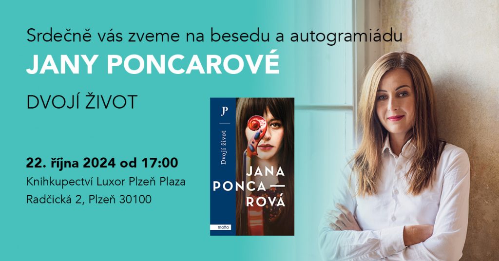 Srdečně vás zveme na besedu a autogramiádu oblíbené autorky Jany Poncarové k její nové knize Dvojí život. Setkání proběhne v úterý 22. října od 17 hodin v knihkupectví Luxor v OC Plaza v Plzni.