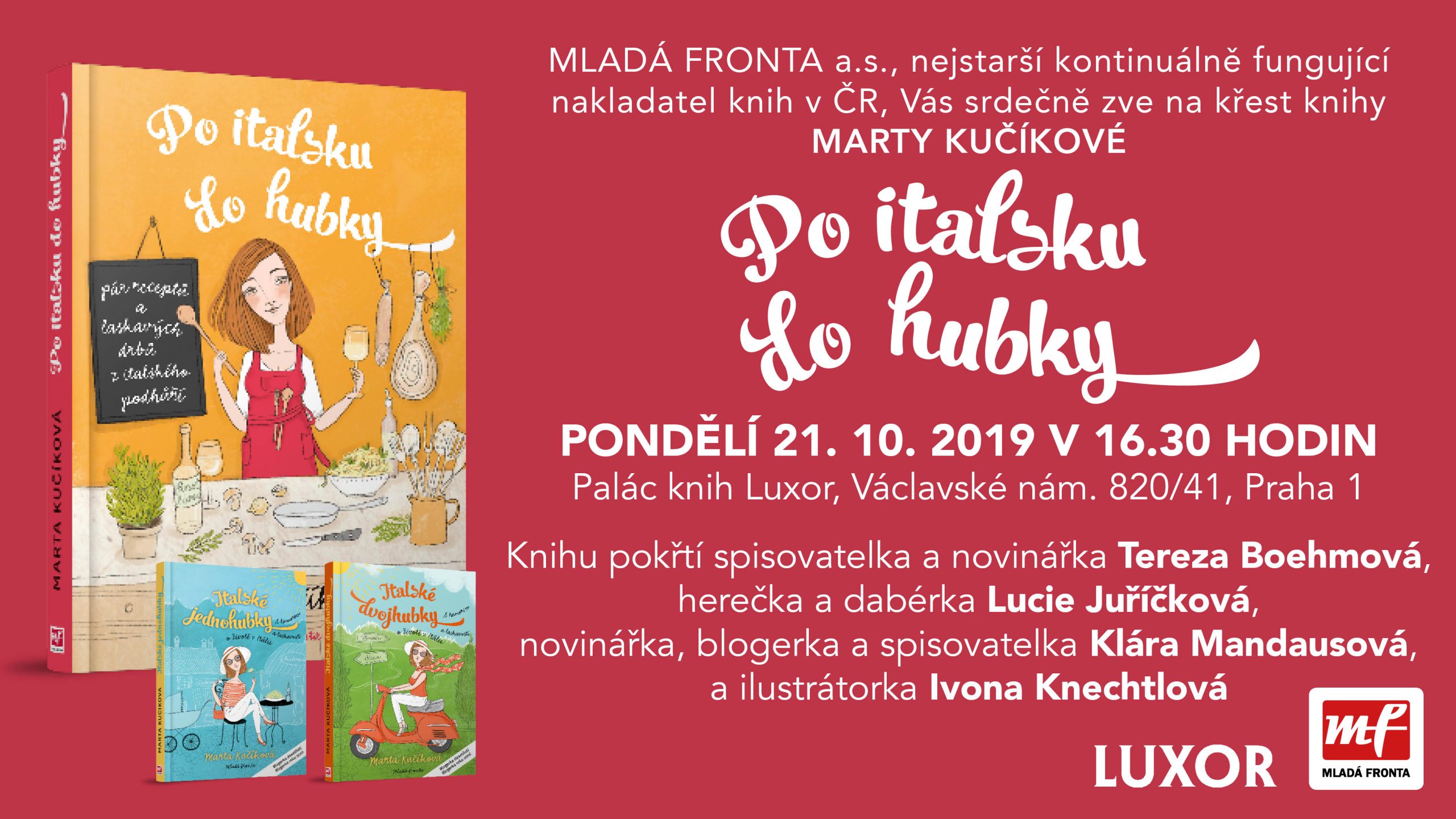 Oblíbená autorka bestsellerů Italské jednohubky a Italské dvojhubky Marta Kučíková přichází s již třetí knihou zaměřenou na kuchyni, půvab i životní styl italského dolomitského podhůří. Knihu Po italsku do hubky, která vás laskavě i s humorem provede taji této oblasti, pokřtíme v Paláci knih Luxor. Kmotrami knihy budou Tereza Boehmová, Lucie Juříčková, Ivona Knechtlová a Klára Mandausová.