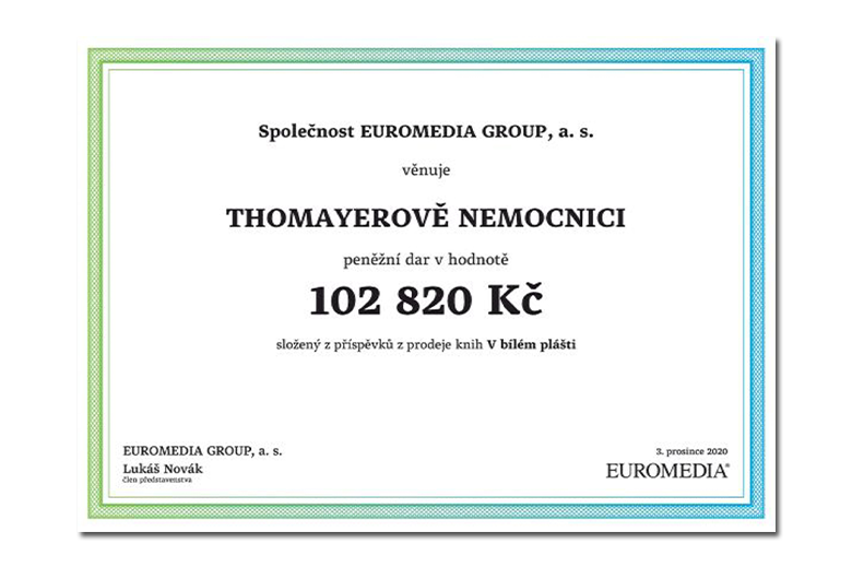 V květnu letošního roku vydalo nakladatelství Euromedia pod značkou Listen povídkovou sbírku V bílém plášti a přislíbili, že z každého prodaného kusu přispějí 20 Kč Thomayerově nemocnici. Tuto informaci jste mohli najít na speciální pásce na knize „Koupí této knihy přispějete 20 Kč Thomayerově nemocnici.“