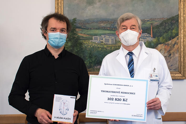 Antonín Kočí, vedoucí nakladatelství, předal šek řediteli nemocnice doc. MUDr. Zdeňku Benešovi, CSc., který byl výší daru opravdu mile překvapen ? Vedení nemocnice bylo zároveň velmi potěšeno, že byla k podpoře vybrána právě jejich nemocnice.