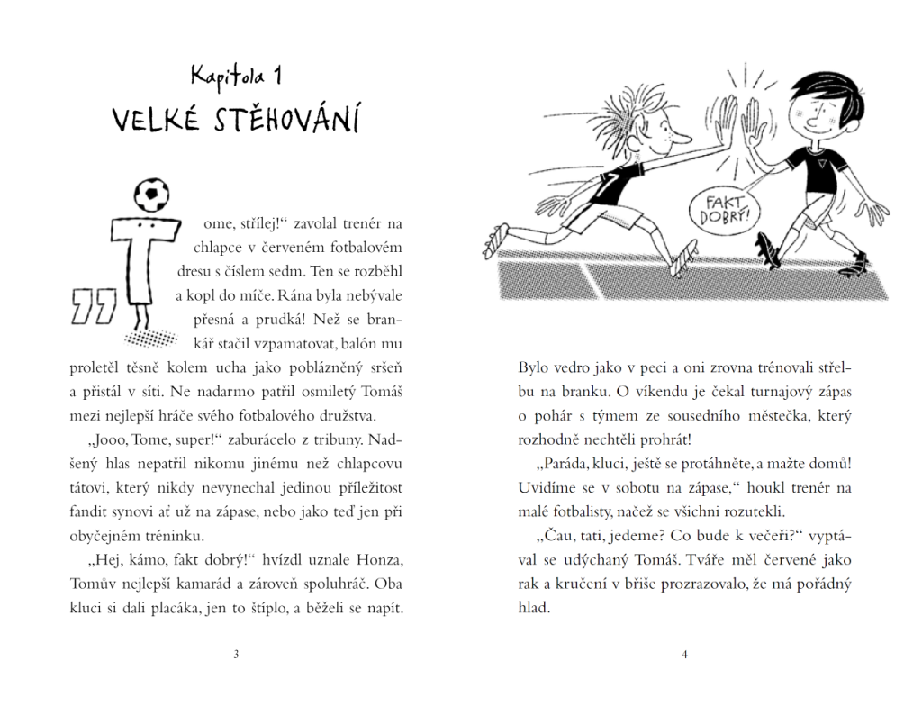 Vtipný a poučný příběh pro kluky (a nejen pro ně) bude bavit milovníky fotbalu, dobrodružství a zábavy! Tomáš je školní fotbalová hvězda se spoustou kamarádů. Teď se ale musí kvůli tátově nové práci přestěhovat na druhý konec země – a ne od každého se mu dočká vřelého přijetí. Jak dopadne rozhodující fotbalový zápas mezi dvěma školními rivaly?