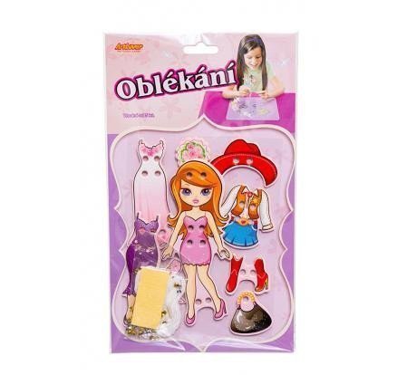 Provlékáním šňůrek dírkami oblékáte postavičky. Nakonec dozdobíte korálkami a máte hotovo. Pro opakované použití, podporuje jemnou motoriku malých dětí. Obsahuje 1 dřevěnou postavičku a oblečení, oboustranně lepících kolečka, korálky a šňůrku.