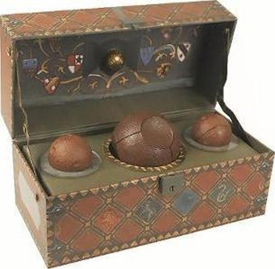 Here is the first officially licensed „Harry Potter Collectible Quidditch Set“ that includes: 1 Quaffle, 2 Bludgers, 1 non-removable Snitch, and 1 16×24″ collectible poster all showcased in a decorative Quidditch trunk. Includes lock and key for trunk.