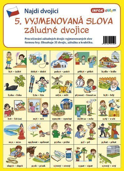 Procvičování záludných dvojic vyjmenovaných slov formou hry. Obsahuje 35 dvojic, záložku a krabičku. Pravidla hry: Hra je určena nejméně pro 2 hráče. Kartičky rozstříhejte, promíchejte a obrázky dolů rozložte na plochu. Každý hráč obrátí kartičku a obrácením druhé hledá k obrázku dvojici. Když neuhodne, vrátí je do původní polohy. Když uhodne, získá dvojici a pokračuje ve hře. Vítězem se stává hráč, který našel nejvíce obrázkových dvojic.