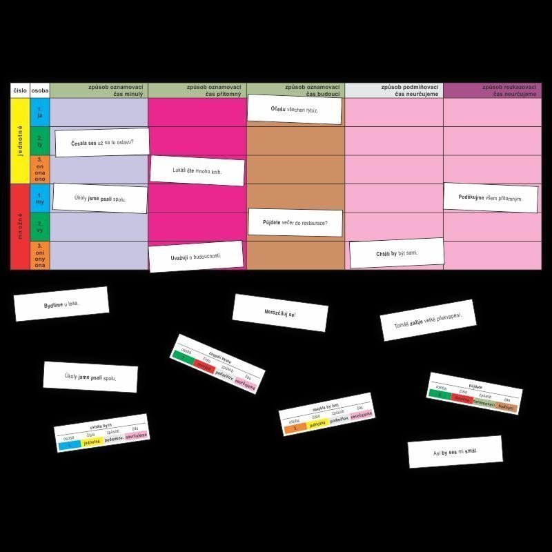 540 kartiček k procvičování určování mluvnických kategorií u sloves.Součástí je i podložka (1kus) – Slovesa – podložka.K sebekontrole je určena barevná strana.
