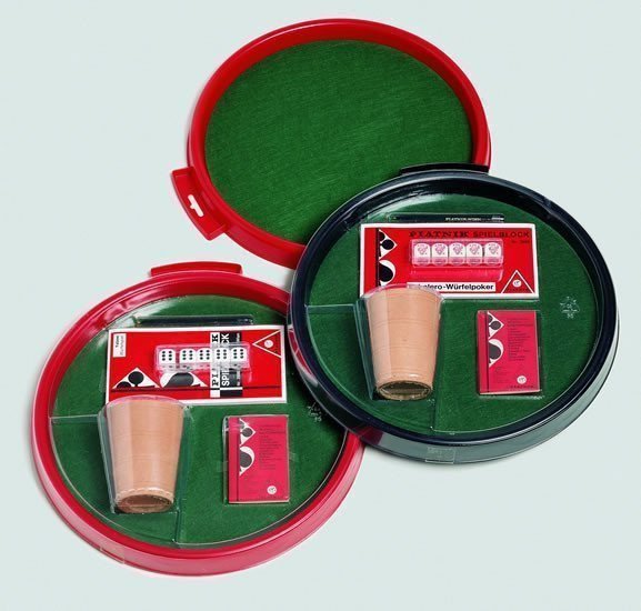 Pro všechny vyznavače hry kostky, kompletní sada standardních kostek. Zahrnuje: kožený kelímek, bloček na záznamy, tužku, standardní kostky-5ks a hrací plocha. Vhodné od 6 let.
