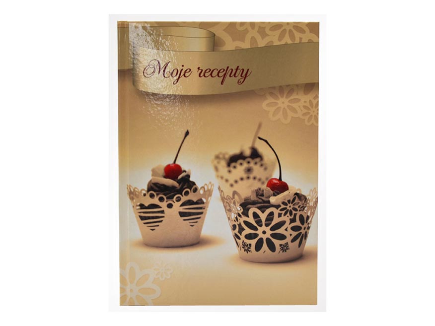 Záznamová kniha – linkovaná – s názvem "Moje recepty". Kniha na recepty může být pěkným dárkem pro vášnivou kuchařku/kuchaře nebo pekařku/pekaře. Svoji sbírku receptů si může zaznamenat na 96 sránkách.